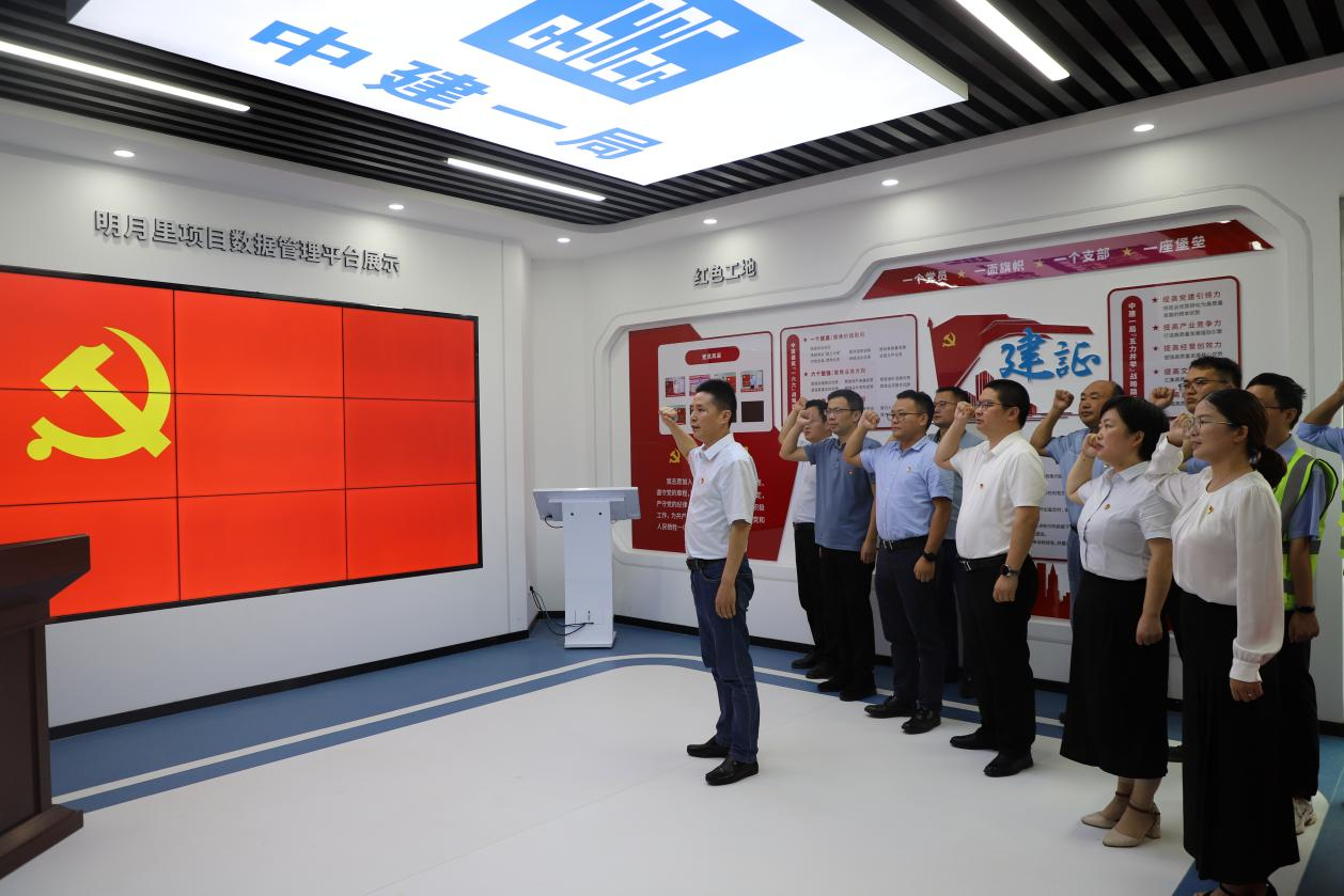在88娱乐城 公司党支部书记、董事长毛雷同志带领下,在明月里项目智慧工地大厅中,全体党员面向鲜红党旗,高举右拳,重温入党誓词,重重许下铮铮誓言。庄严的誓词,一字一句,铿锵有力,激荡在项目建设现场,更激荡在每一名项目建设者的心中,时刻警醒着同志们检视初心、坚定信念、凝聚力量、奋勇拼搏、砥砺前行。