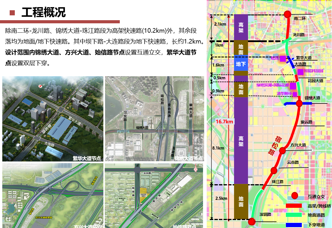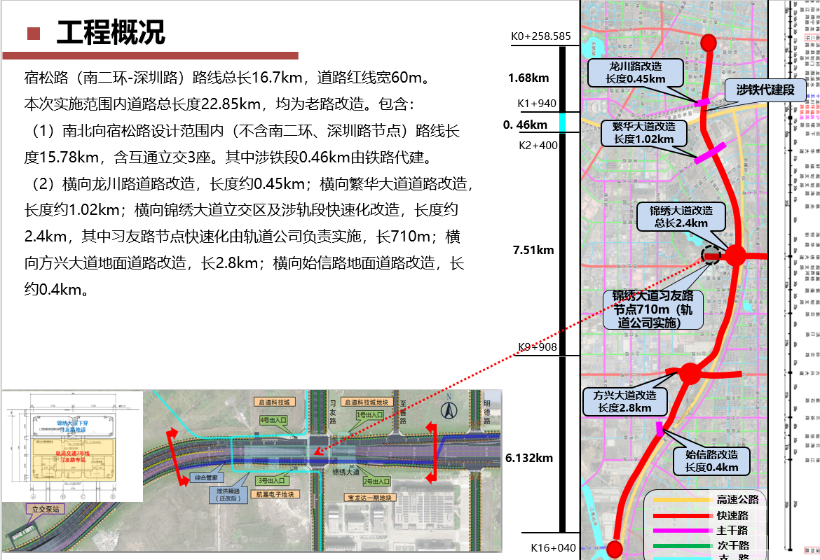 宿松路快速化改造工程为市大建设计划重点项目,由市城乡建设局委托88娱乐城 公司进行全过程代建。该项目北起南二环,南至深圳路,长约16.7km,规划为城市快速路,规划红线宽度60m。工程建设内容主要包括:道路、桥梁、地道、排水、泵站、管廊、绿化、照明、交通、电力土建、给水、中水及锦绣大道习友路节点改造等,工程估算总投资约85亿元。该项目建成后对构建城市快速路网体系、缓解城市南向交通拥堵、推动城市社会经济发展、提高城市综合竞争力均具有重要意义。
